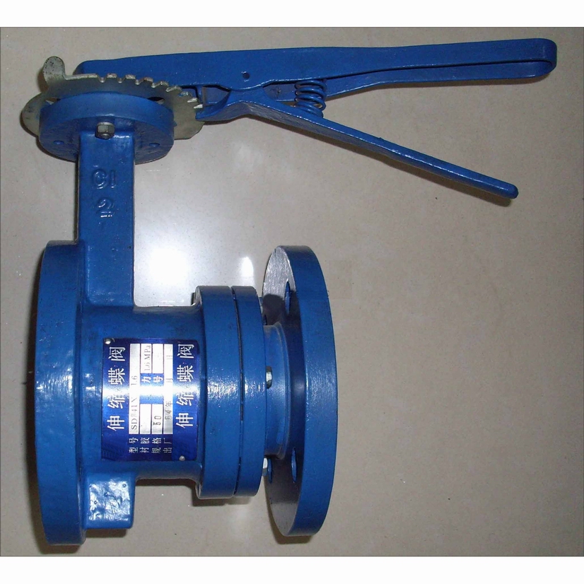 产品说明SD41X/SD43H手动法兰式伸缩蝶阀具有自动补偿管道热胀冷缩方便装卸的功能,使用于温度在425℃以下,公称压力在1.6MPa以下的石油、化工、电力、造纸、给排水和市政建设等工业管道上作调节流量和载断流体的最佳装置。产品特点1、结构独特,设计灵活,重量轻,省力,启闭迅速。2、手动伸缩蝶阀不仅能补偿管道温差缩产生的热胀冷缩的功能,还能为维修阀门安装更换提供方便。 3、密封部位可调节更换,密封性能可靠。 性能参数